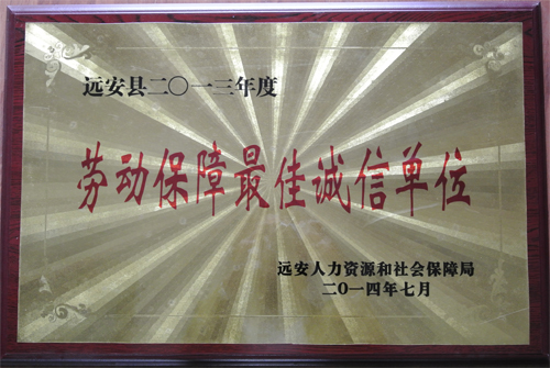 10月16日下午,遠(yuǎn)安縣勞動保障監(jiān)察局局長王洪一行來到陶星陶瓷公司,授予陶星陶瓷公司2013年度“勞動保障最佳誠信單位”榮譽(yù),陶星陶瓷總經(jīng)理杜修全代表公司領(lǐng)取獎牌。這是該公司自2011年來連續(xù)三年獲得該項殊榮。
