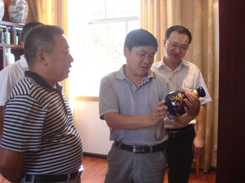 周向東(中)察看陶星陶瓷產(chǎn)品實樣