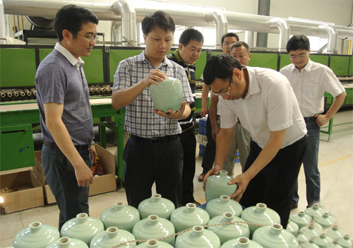 在公司總經(jīng)理杜修全、副總經(jīng)理陳成的陪同下,蘇海濤一行深入車間現(xiàn)場,實(shí)地考察了公司高檔酒瓶生產(chǎn)車間、釉下五彩工作室和試制車間。參觀過程中,蘇海濤看到正在貼花的釉下彩十二生肖茶杯時(shí),盛贊產(chǎn)品如手工藝品一般,光鮮亮麗的手工貼花、精致可人的生肖圖案,讓人賞心悅目。